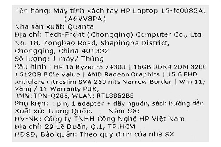 Laptop HP 15 fc0085AU - A6VV8PA (R5 7430U, 16GB, 512GB, Full HD, Win11)