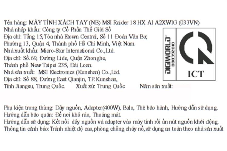Laptop MSI Raider 18 HX AI A2XWIG - 033VN (Ultra 9 285HX, 64GB, 4TB, RTX 5080 16GB, 4K 120Hz, Win11)