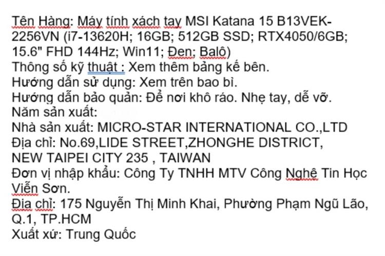 Laptop MSI Gaming Katana 15 B13VEK - 2256VN (i7 13620H, 16GB, 512GB, RTX4050 6GB, Full HD 144Hz, Win11)