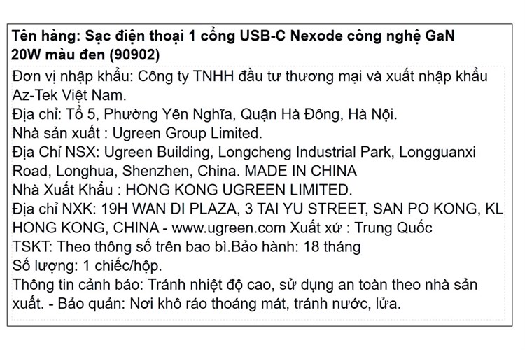 KOHNAN - 071122 Sạc Type C 20W UGREEN 90902