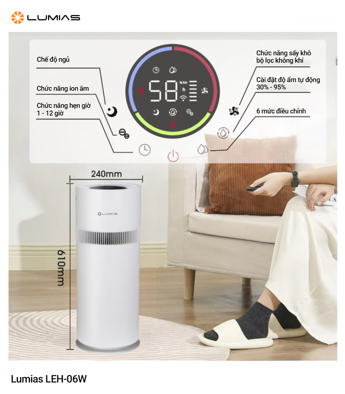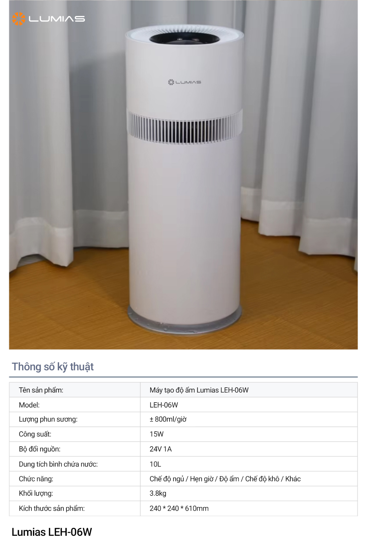 Máy tạo độ ẩm dung tích 10L chức năng ion âm Lumias LEH-06W
