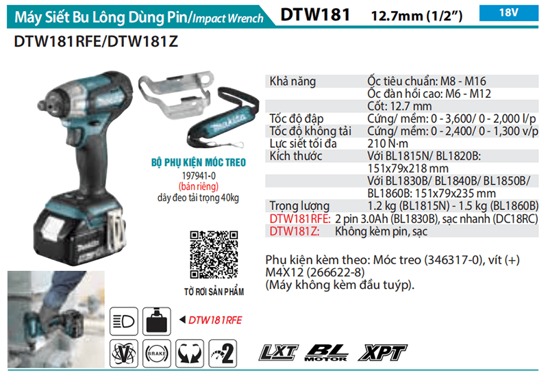 Máy Siết Bu Lông Dùng Pin 18V 12.7mm Makita DTW181Z