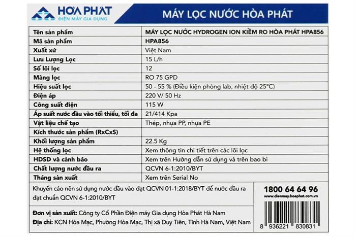 Máy lọc nước RO Hydrogen ion kiềm Hòa Phát HPA856 12 lõi
