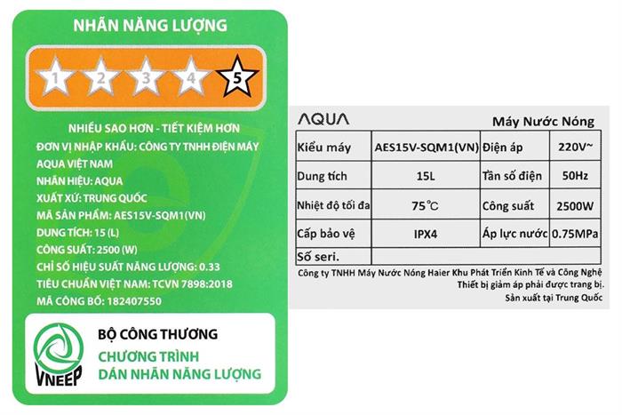 Máy nước nóng gián tiếp Aqua 15 lít 2500W AES15V-SQM1(VN)