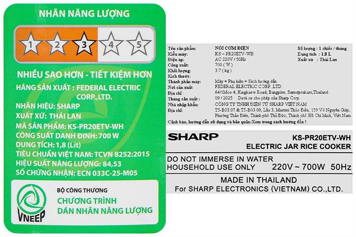 Nồi cơm nắp gài Sharp 1.8 lít KS-PR20ETV-WH