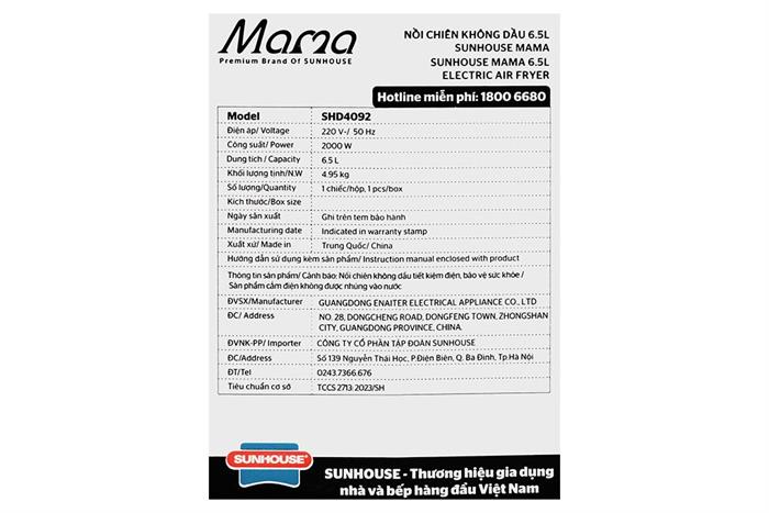 Nồi chiên không dầu Sunhouse Mama SHD4092 6.5 lít
