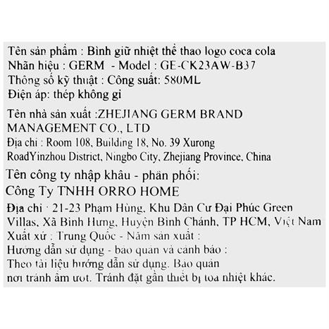 Ly giữ nhiệt inox 580 ml Thể Thao Coca Cola GERM GE-CK23AW-B37