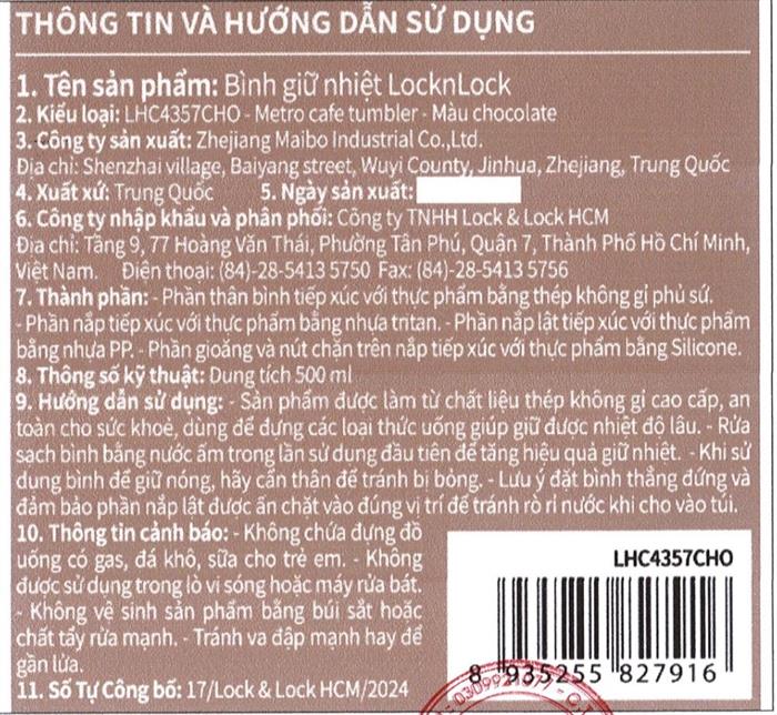 Bình giữ nhiệt inox 500 ml Metro Cafe Lock&Lock LHC4357CHO