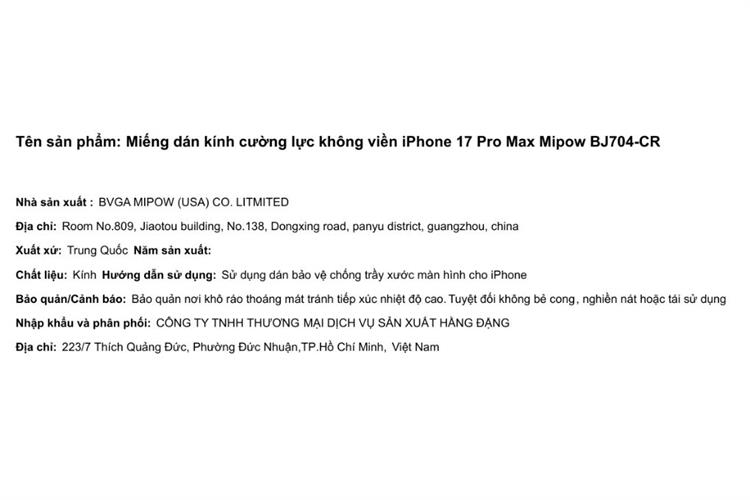 Bạn đang chuyển đến trang bán sản phẩm Miếng dán kính cường lực không viền iPhone 17 Pro Max Mipow BJ704-CR
