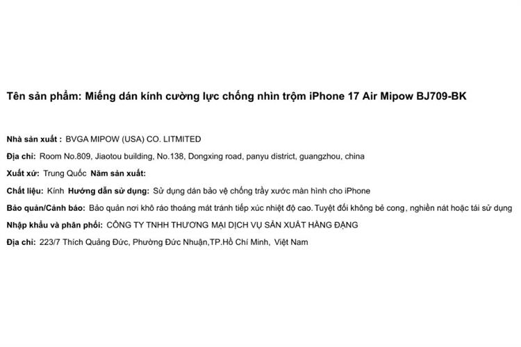 Miếng dán kính cường lực chống nhìn trộm iPhone Air Mipow BJ709-BK