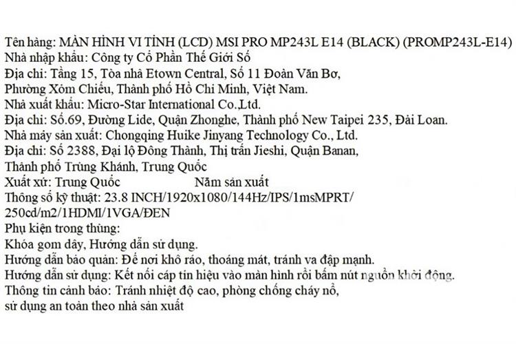 Màn hình Gaming MSI PRO MP243L-E14 (23.8 inch Full HD, IPS, 144Hz, 4ms)