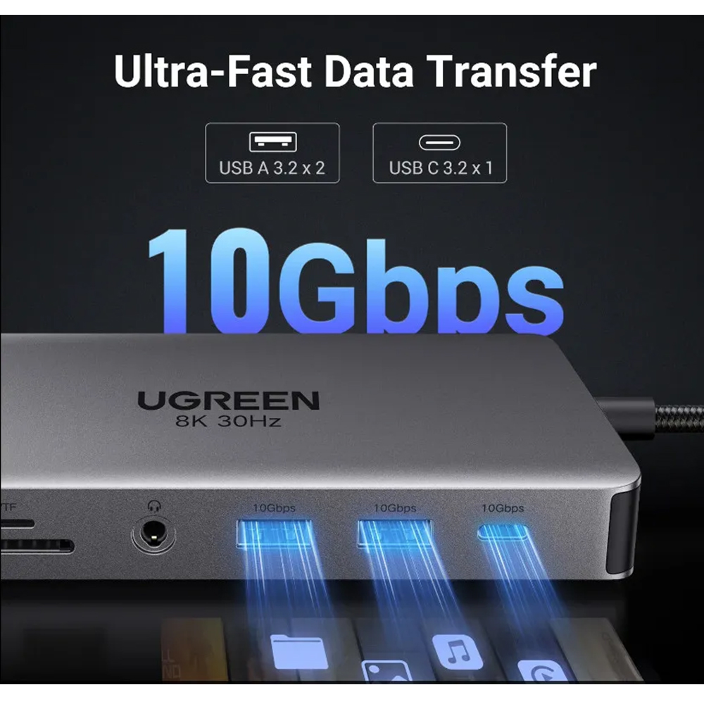 Bộ chuyển đổi USB-C sang 2*USB-A 3.2+1*USB-A 3.0+1*USB-C 3.2+2*HDMI 8K@30Hz+LAN+SD/TF+3.5mm Ugreen (15965)