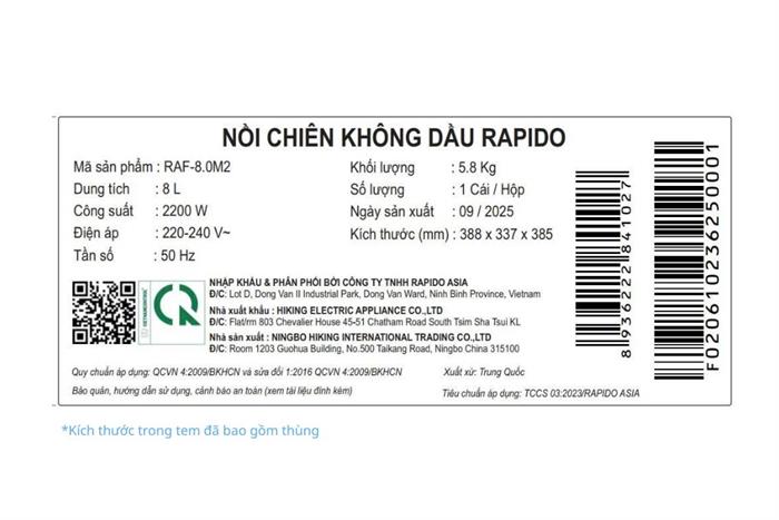 Nồi chiên không dầu Rapido RAF-8.0M2 8 lít