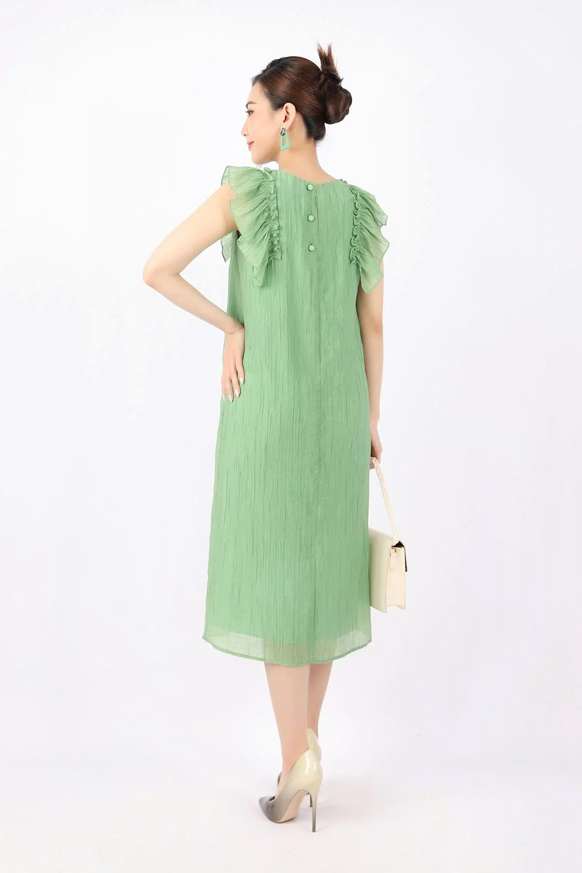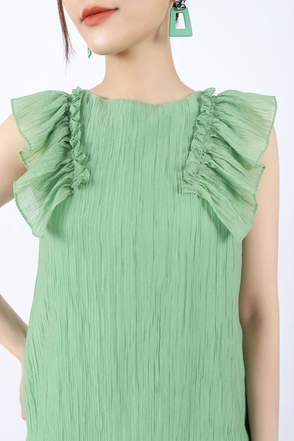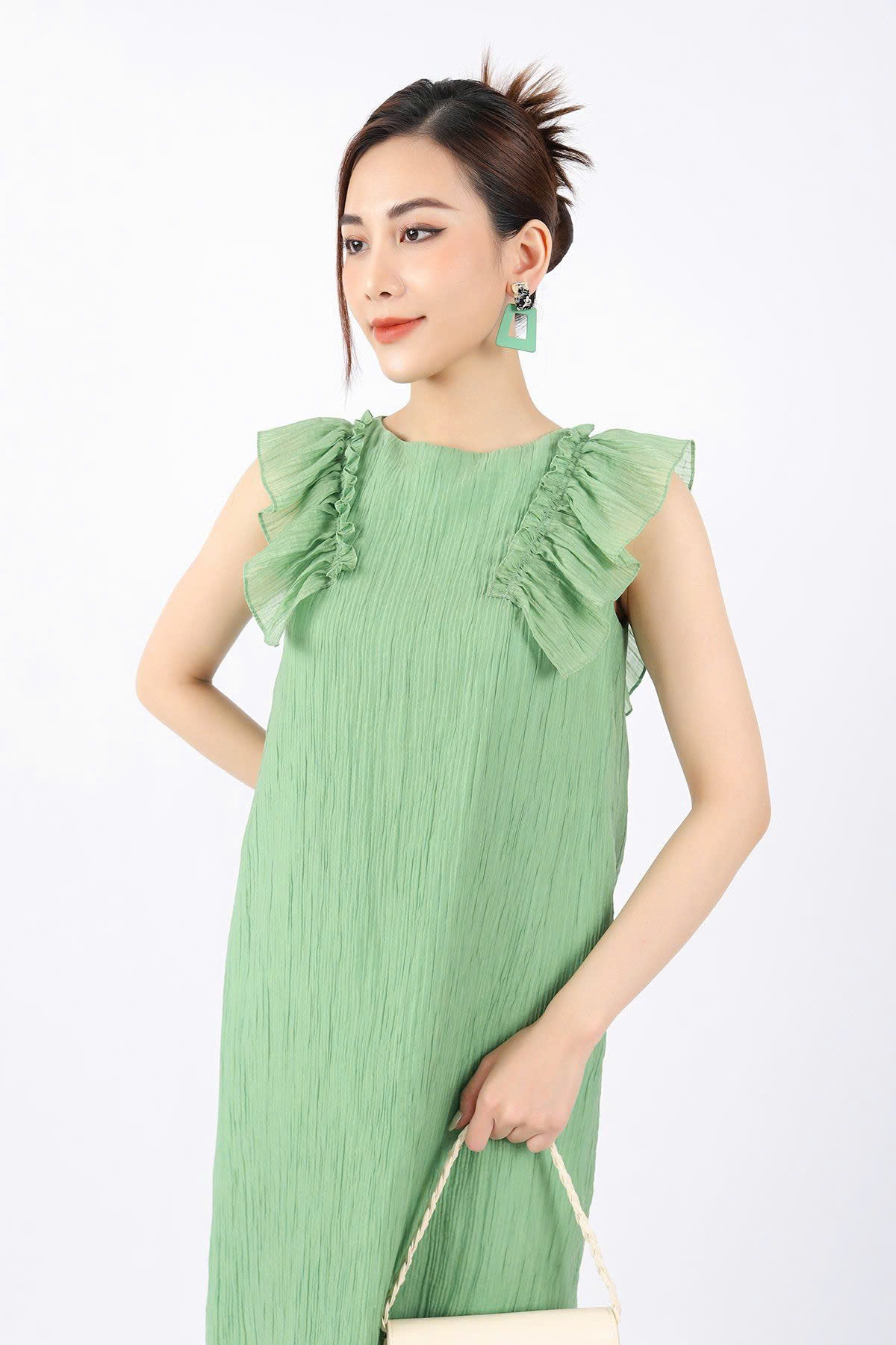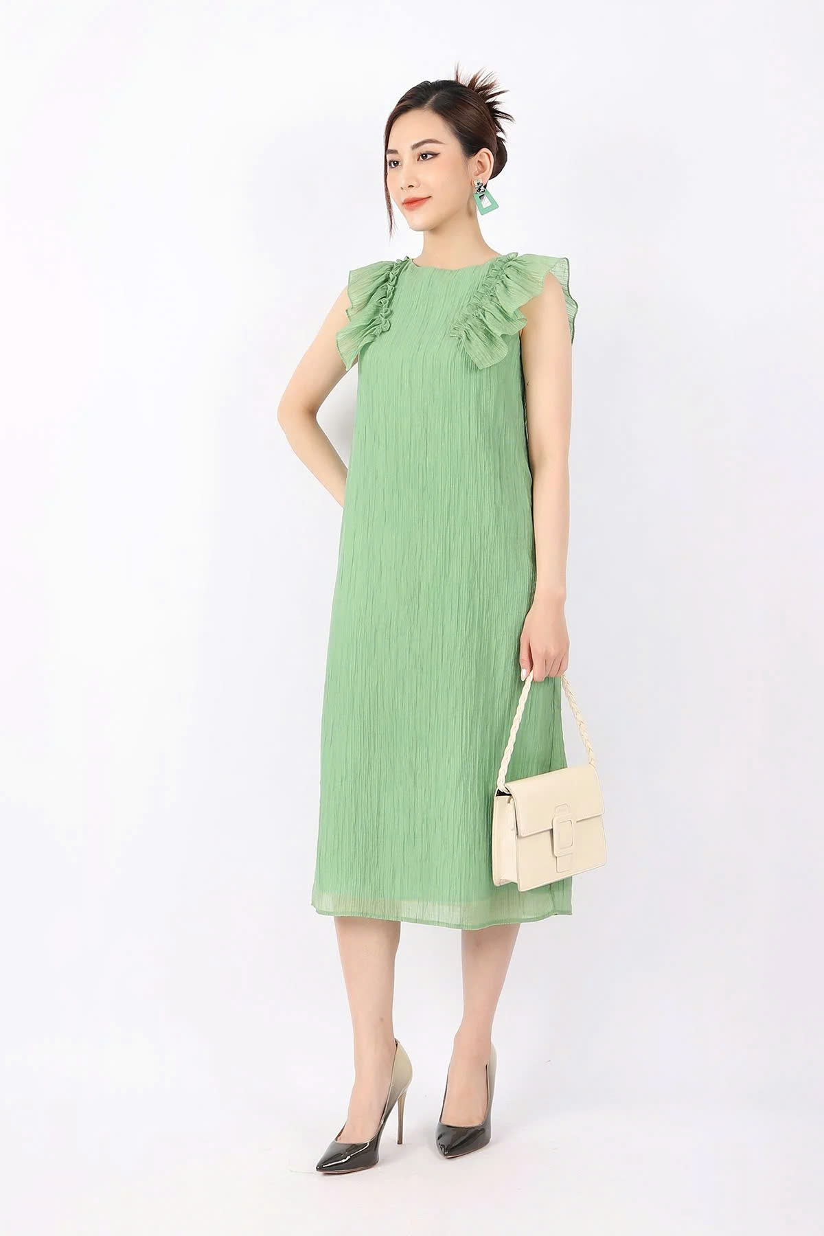 Bạn đang chuyển đến trang bán sản phẩm FDP33089 - Đầm dạo phố vải voan nhăn dáng suông cổ tròn vai phối bèo tạo kiểu - PANTIO