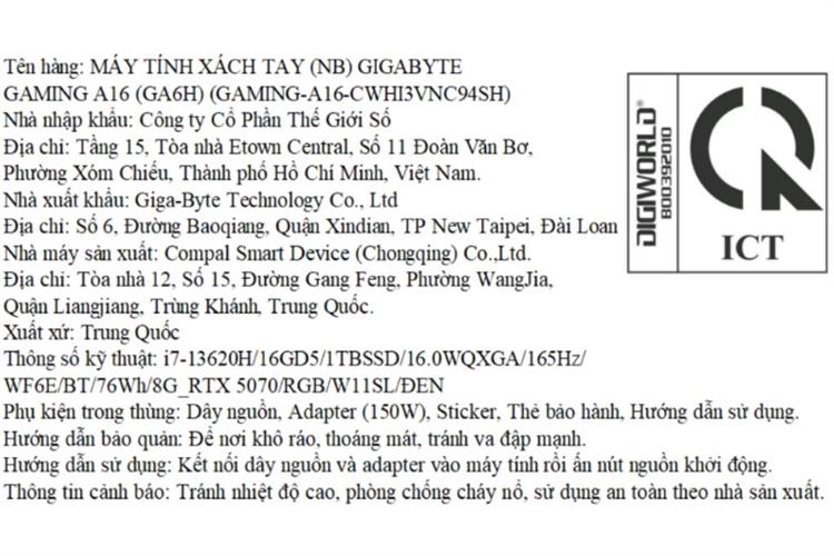 Bạn đang chuyển đến trang bán sản phẩm Laptop GIGABYTE Gaming A16 GA6H - CWHI3VNC94SH (i7 13620H, 16GB, 1TB, RTX 5070 8GB, WQXGA 165Hz, Win11)
