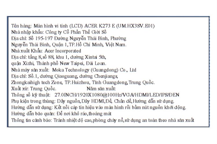 Màn hình Acer K273 E 27 inch FHD/IPS/100Hz/1ms/HDMI