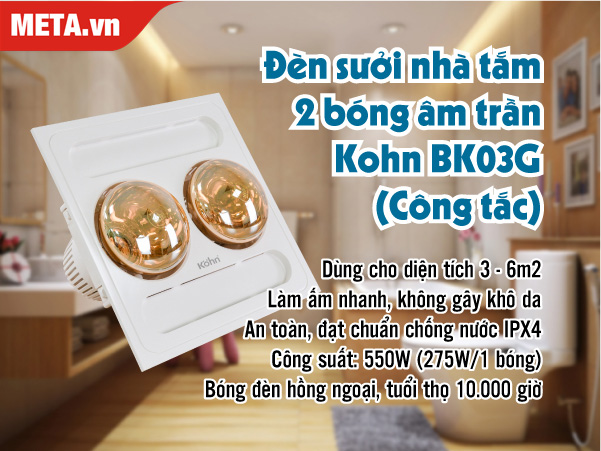 Đèn sưởi nhà tắm 2 bóng âm trần Kohn BK03G (Công tắc)